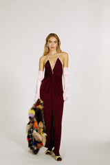 Myralise dress in fluid jersey with a soft, subtly lustrous hand, designed for those evenings when one gesture is all it takes to be ready. The plunging halterneck, central draping and column silhouette shape the figure effortlessly, while the front slit adds a touch of understated seduction. Crafted from a precious leftover of our HER FW18 collection, it’s the kind of evening dress you slip on in seconds and keep on until the very last toast.