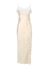 Rose gown in pure silk with French lace trims, cut on the bias in the style of old-Hollywood slip dresses. Crafted from a precious leftover from our Oceano Mare Spring Summer 20 collection, it skims the body creating a fluid, sensual silhouette, enhanced by the side slit framed in lace.