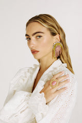Zabaione is the “Sunday morning in the countryside” dress you’ve always dreamed of: light, pure white, with that romantic volume that moves at every step. The cotton broderie anglaise draws tiny cut-outs on the skin, while the wide collar with pure silk organza ruffles frames the décolleté like an impalpable stole. Balloon sleeves and real mother-of-pearl buttons complete the play between innocence and drama, to wear with jeweled sandals, lace socks or simply barefoot in the garden.