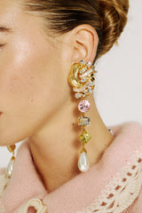 Aurora earrings in brass with glass, Preciosa crystals and a dangling freshwater pearl – as if they were found in an old hat box full of family treasures. The top wraps the lobe like a small golden knot embroidered with crystals, while the three central glass stones – in pink, champagne and pale yellow – fall vertically to create a column of light. Finishing the piece, a freshwater pearl drop that swings gently with every step.