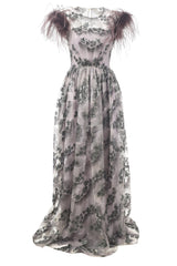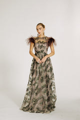 Crafted from fine tulle embroidered with tiny sequin flowers, it features an integrated slip in pure silk georgette that gently skims the body and creates soft, dreamy transparencies. The shoulders are finished with clouds of marabou feathers, ethically gathered, adding movement and drama with every step.