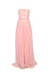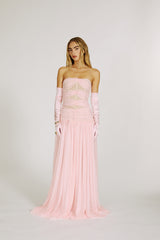 Roseraie gown in 100% pure silk creponne, entirely hand–draped on the mannequin – a couture daydream in powdery rose. The boned bodice in silk organza sculpts the waist like an ultra-light corset, while the sheer cut-out panels trace a petal-like pattern on the skin. The skirt falls to the floor in weightless layers of creponne, moving like a soft cloud with every step.