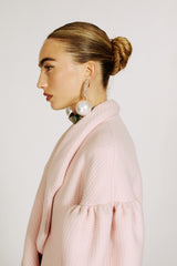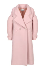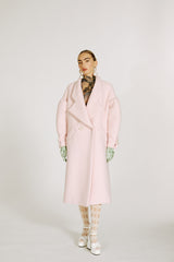Cupcake coat with dropped shoulders, an oversized, ultra-soft silhouette, made in powder-pink double crepe from a precious leftover of our To The Moon & Back FW22 collection. As cosy as a blanket but with the allure of a couture piece, it features wide lapels, a double-breasted closure and softly gathered sleeves that make it instantly recognisable.