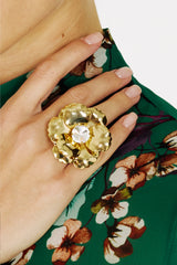 BLOOM is a gold-tone brass ring that feels like a tiny garden on your hand: the setting forms a three-dimensional flower, at the centre, a brighter “dew drop” stone keeps all the sparkle in focus.