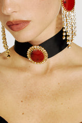 The Opaline choker is a black velvet ribbon that looks straight out of a late-19th-century portrait: in the centre, a gold-tone brass medallion with an opal-effect cabochon and tiny Preciosa crystals frames the neck like a modern cameo. Perfect with the Ivy Charm dress, or to turn a simple top into a statement look.