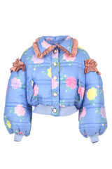 Bombolone puffer: a quilted jacket that looks like it came straight out of a luxury patisserie. The sky-blue base is covered in oversized pastel flowers, while the blush satin ruffles on the collar and sleeves add that frou-frou touch that feels instantly Greta girl. The cropped, voluminous shape is designed to keep you warm without weighing down your look.