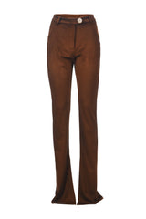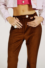 Moka is the eco suede trouser that feels like it’s been stolen from a romantic rockstar’s wardrobe: slim along the leg, extra-long at the hem, with a soft drape that skims over the shoes and instantly elongates the silhouette.