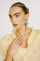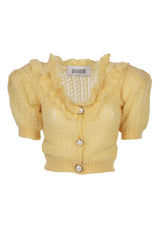 Chantilly cardigan in a soft mohair yarn: a little jewel to keep always on hand, a true wearable cuddle. The light openwork knit, V-neck framed by a soft ruffle and gently puffed short sleeves strike the perfect balance between ladylike and sensual. Jewel buttons finish the piece with a luminous touch – discreet yet irresistible.