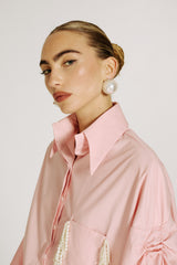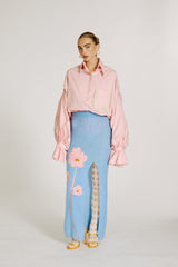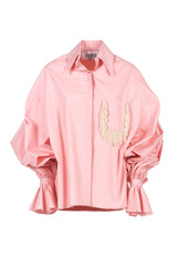 Daisy shirt in cotton poplin, the girly take on a classic men’s shirt. The fit is soft and oversized, with statement gathered sleeves and ruffled cuffs that look like petals. The patch pocket is embroidered with a cascade of jewel fringes that move with every step – the slightly theatrical detail that turns even simple denim into a look to remember.