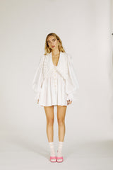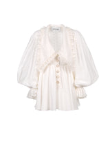 Zabaione is the “Sunday morning in the countryside” dress you’ve always dreamed of: light, pure white, with that romantic volume that moves at every step. The cotton broderie anglaise draws tiny cut-outs on the skin, while the wide collar with pure silk organza ruffles frames the décolleté like an impalpable stole. Balloon sleeves and real mother-of-pearl buttons complete the play between innocence and drama, to wear with jeweled sandals, lace socks or simply barefoot in the garden.