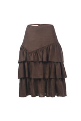 Mousselie skirt in 100% chocolate–brown linen – the more relaxed (but still très chic) sister of our moiré Mousselie. The shape is midi and high-waisted, with a wide flounce at the hem that moves softly as you walk: it feels like a 1970s Italian holiday skirt, reimagined for today’s wardrobe.