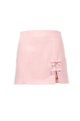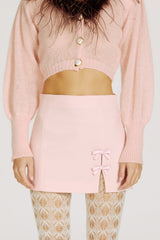Bow mini skirt in wool faille, the little “candy” of the Greta Boldini wardrobe. We’ve reimagined our iconic Suzette in an even more playful version: a clean, tailored line, a slightly widened front slit and two tiny bows “stitched” over it, as if they were holding everything together at the very last moment. The result is a mini that looks demure at first glance, but is absolutely ready to steal the scene with lace tights and jewel sandals.