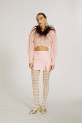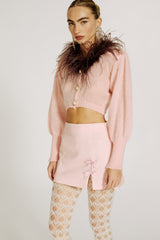 Croissant Royal cardigan, the queenly edition of our iconic Croissant. Same cropped, waist-skimming shape and statement buttons, but this time the neckline is crowned with soft marabou feathers, turning any outfit into an instant party look.