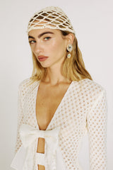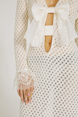 Sucreine dress in 100% cotton jersey – the most coveted piece of the collection, looking as if it stepped straight out of a bucolic daydream. The openwork knit is light yet crisp, tracing a net of tiny diamonds on the skin, while the oversized bow at the front and central cut-out create a super-feminine, peekaboo effect. The cuffs are finished in delicate French lace, adding a touch of heirloom lingerie to the silhouette.